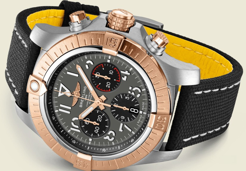 Часы Breitling Avenger B01 Chronograph 45 представлены в корпусе размером 45 х 15.7 мм из нержавеющей стали и розового золота 18к водонепроницаемостью 300 метров. Внутри корпуса установлен автоматический механизм, Калибр Breitling 01, обладающий запасом хода 70 часов. На сером циферблате отображаются часы, минуты, секунды, накопители хронографа. Часы поставляются на текстильном ремешке с застежкой из нержавеющей стали. Серия ограничена - 250 шт.