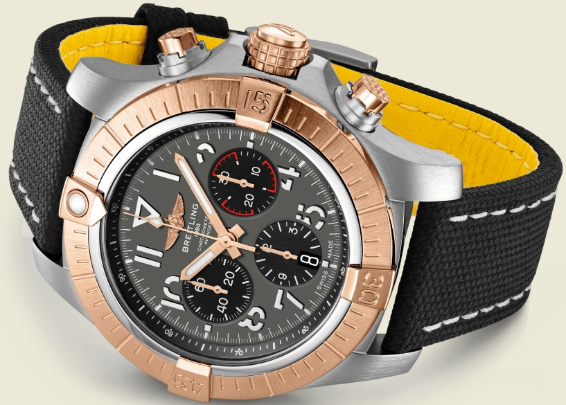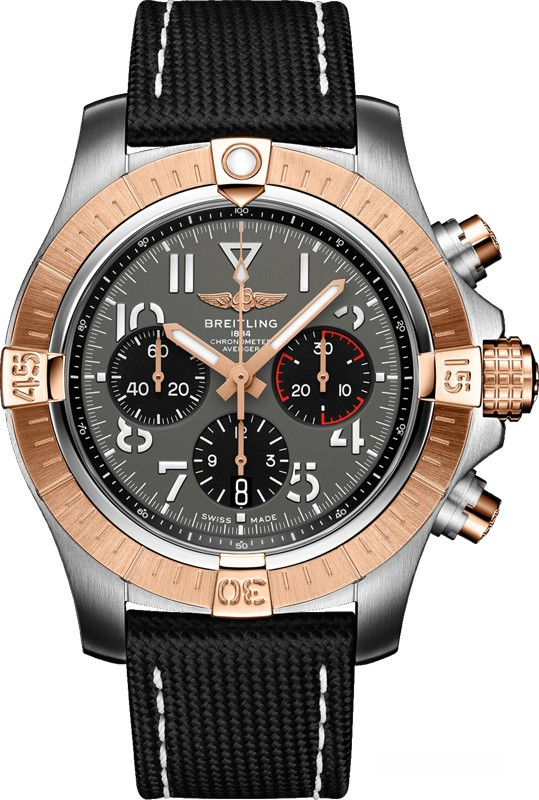 Часы Breitling Avenger B01 Chronograph 45 представлены в корпусе размером 45 х 15.7 мм из нержавеющей стали и розового золота 18к водонепроницаемостью 300 метров. Внутри корпуса установлен автоматический механизм, Калибр Breitling 01, обладающий запасом хода 70 часов. На сером циферблате отображаются часы, минуты, секунды, накопители хронографа. Часы поставляются на текстильном ремешке с застежкой из нержавеющей стали. Серия ограничена - 250 шт.