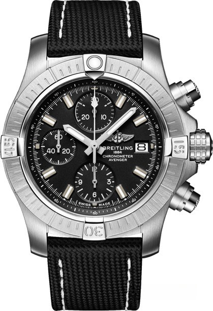 Часы Breitling Avenger Chronograph 43 mm представлены в корпусе из нержавеющей стали размером 43 мм и водонепроницаемостью до 300 метров. Внутри корпуса установлен автоматический механизм, Калибр Breitling 13 с запасом хода 48 часов. На черном циферблате отображаются часы, минуты, секунды, дата. Часы комплектуются текстильным ремешком с вставкой из нержавеющей стали.