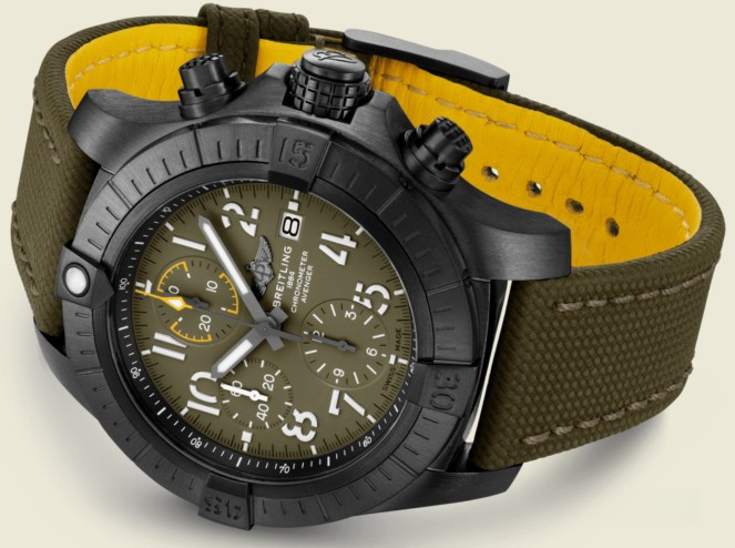 Часы Breitling Avenger Chronograph 45 mm представлены в корпусе из титана с покрытием DLC размером 45 мм и водонепроницаемостью до 300 метров. Внутри корпуса установлен автоматический механизм, Калибр Breitling 13 с запасом хода 48 часов. На зеленом циферблате отображаются часы, минуты, секунды, дата. Часы комплектуются текстильным ремешком с вставкой из титана.