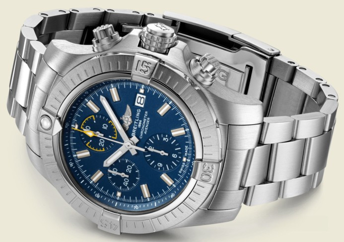Часы Breitling Avenger Chronograph 45 mm представлены в корпусе из нержавеющей стали размером 45 мм и водонепроницаемостью до 300 метров. Внутри корпуса установлен автоматический механизм, Калибр Breitling 13 с запасом хода 48 часов. На синем циферблате отображаются часы, минуты, секунды, дата. Часы комплектуются браслетом из нержавеющей стали.