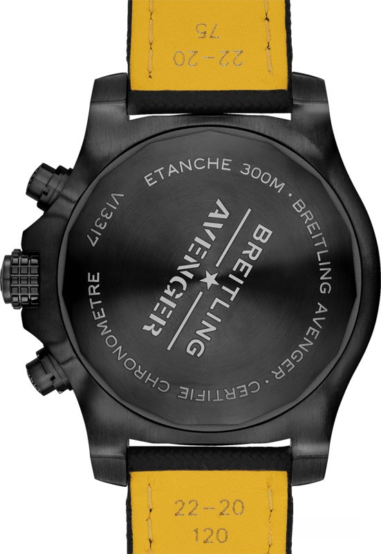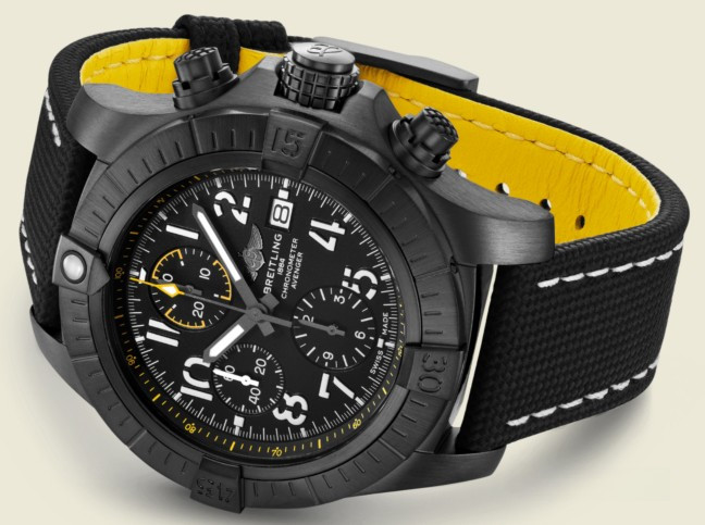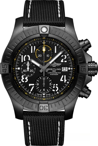 Часы Breitling Avenger Chronograph 45 mm представлены в корпусе из титана с покрытием DLC размером 45 мм и водонепроницаемостью до 300 метров. Внутри корпуса установлен автоматический механизм, Калибр Breitling 13 с запасом хода 48 часов. На черном циферблате отображаются часы, минуты, секунды, дата. Часы комплектуются текстильным ремешком с вставкой из титана.