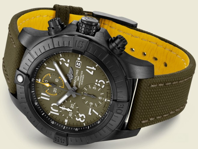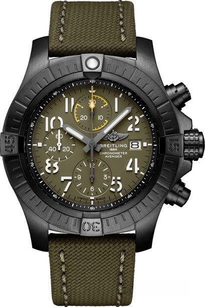 Часы Breitling Avenger Chronograph 45 mm представлены в корпусе из титана с покрытием DLC размером 45 мм и водонепроницаемостью до 300 метров. Внутри корпуса установлен автоматический механизм, Калибр Breitling 13 с запасом хода 48 часов. На зеленом циферблате отображаются часы, минуты, секунды, дата. Часы комплектуются текстильным ремешком с вставкой из титана.