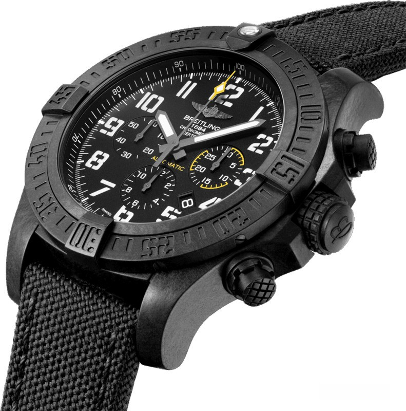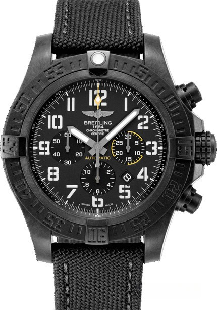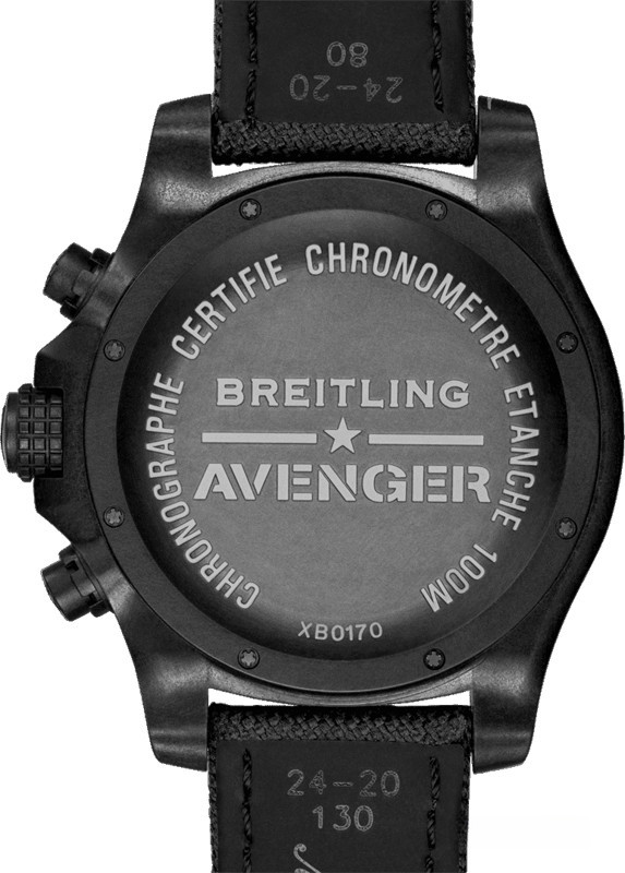 Часы Breitling Avenger Hurricane 12H представлены в корпусе из Breitlight размером 50 х 16.97 мм и водонепроницаемостью 100 метров. Корпус выполнен из материала Breitlight®, эксклюзивного высокотехнологичного материала, который в 3,3 раза легче титана, и в 5,8 легче стали, и который при этом значительно прочнее обоих. Материал обладает устойчивостью к царапинам, трению и коррозии, стойкостью к температурным перепадам, антимагнитными и гипоаллергенными свойствами. Внутри корпуса установлен автоматический механизм, Калибр Breitling 01, обладающий запасом хода 70 часов. На черном циферблате отображаются часы, минуты, секунды, дата, накопители хронографа. Часы поставляются на текстильном ремешке с титановой вставкой.