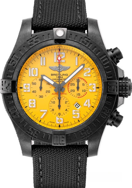 Часы Breitling Avenger Hurricane 12H представлены в корпусе из Breitlight размером 50 х 16.97 мм и водонепроницаемостью 100 метров. Корпус выполнен из материала Breitlight®, эксклюзивного высокотехнологичного материала, который в 3,3 раза легче титана, и в 5,8 легче стали, и который при этом значительно прочнее обоих. Материал обладает устойчивостью к царапинам, трению и коррозии, стойкостью к температурным перепадам, антимагнитными и гипоаллергенными свойствами. Внутри корпуса установлен автоматический механизм, Калибр Breitling 01, обладающий запасом хода 70 часов. На желтом циферблате отображаются часы, минуты, секунды, дата, накопители хронографа. Часы поставляются на текстильном ремешке с титановой вставкой.