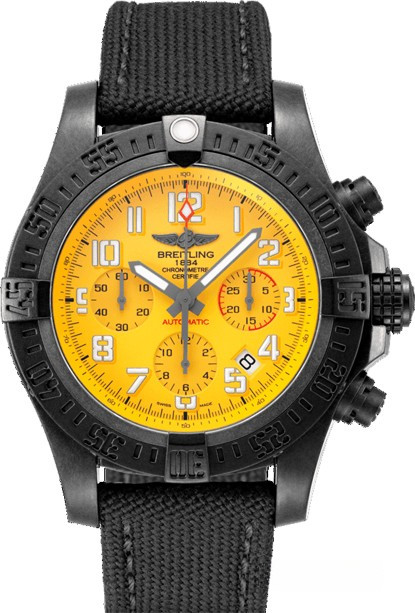 Мужские часы Avenger Hurricane 45 изготовлены в корпусе из сплава Breitlight размером 45 х 16.2 мм и водонепроницаемостью 100 метров. На желтом циферблате отображаются часы, минуты, секунды, дата, накопители хронографа. Апертура даты расположена между 4-мя и 5-ю часами. Внутри корпуса установлен автоматический механизм Breitling 01 с запасом хода 70 часов. Безель часов вращающийся. Часы комплектуются текстильным ремешком с титановой вставкой.