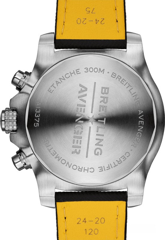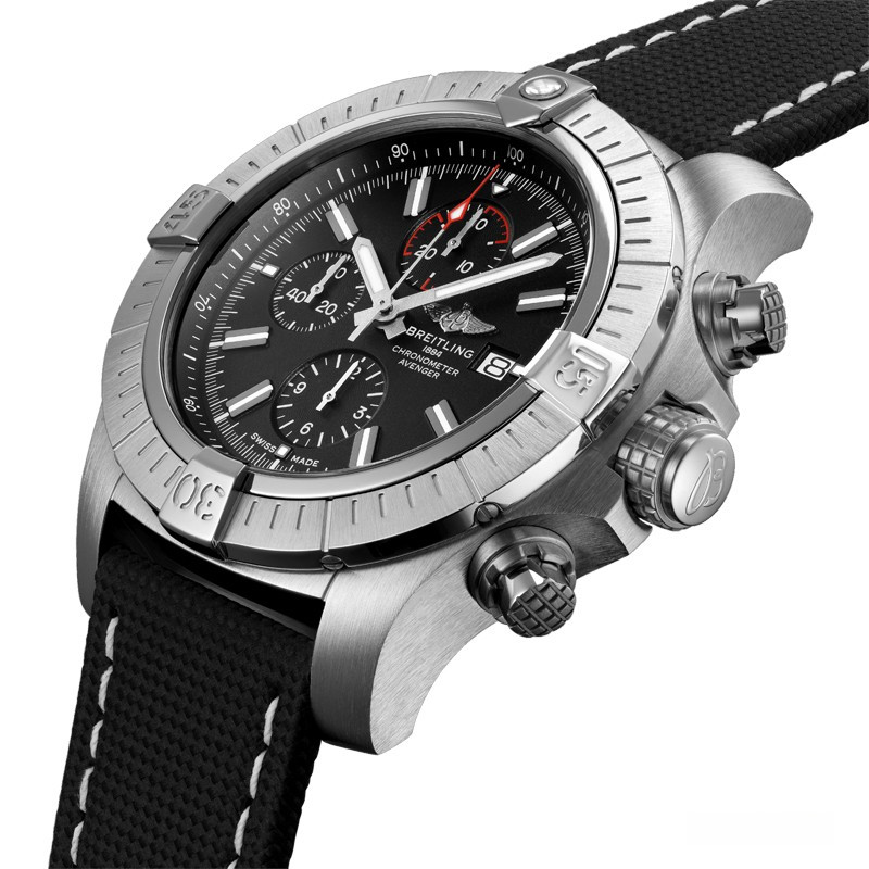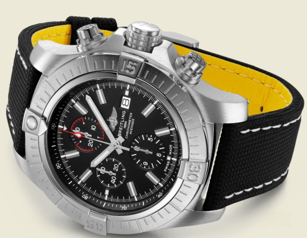 Часы Breitling Super Avenger Chronograph 48 mm представлены в корпусе из нержавеющей стали размером 48 х 17.73 мм и водонепроницаемостью до 300 метров. Внутри корпуса установлен автоматический механизм, Калибр Breitling 13 с запасом хода 48 часов. На черном циферблате отображаются часы, минуты, секунды, дата. Часы комплектуются текстильным ремешком с вставкой из нержавеющей стали.