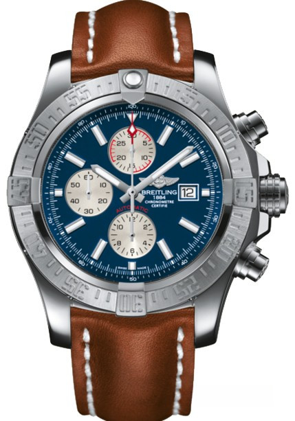 Идеальный спутник для самых экстремальных миссий, хронограф Super Avenger II впечатляющего диаметра 48 мм имеет мощный и крайне профессиональный облик. Его стальной корпус, сохраняющий водонепроницаемость до глубины в 300 м, готов к самым экстремальным подвигам благодаря своей прочной конструкции, заглубленной нажимной кнопке с заглушкой и массивной винтовой заводной головке с нескользящим покрытием. Механизм хронографа с автоподзаводом имеет сертификат Швейцарского института хронометрии (COSC), что подтверждает высшие показатели по точности и надёжности этого шедевра часовой индустрии, это единственный механизм, созданный по международному стандарту. На синем с серебристым циферблате отображаются часы, минуты, секунды и дата. Часы комплектуются кожаным ремешком с вставкой из нержавеющей стали.