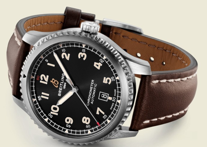 Breitling Aviator 8 Automatic 41 представлен в 41-миллиметровом корпусе из нержавеющей стали. Циферблат черного цвета. Часовая и минутная стрелки, а также арабские цифры покрыты Super-LumiNova для оптимальной разборчивости в любых условиях освещения. Внутри корпуса находится механизм Breitling 17 с балансовой частотой 4 Гц (28 800 полуколебаний в час) и запасом хода 38 часов. Его точность подтверждена сертификатом COSC. Часы поставляются на кожаном ремешке с вставкой из нержавеющей стали.