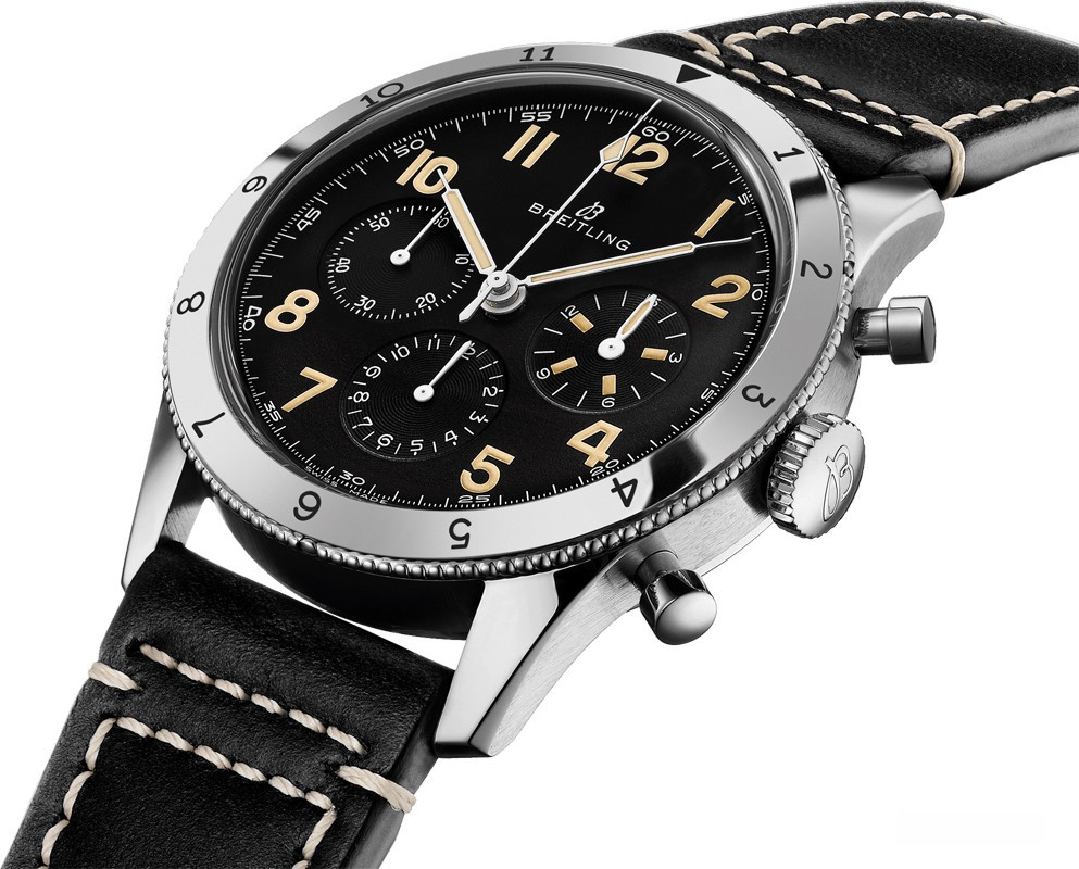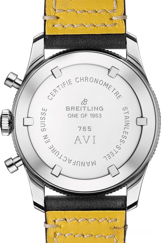 Часы Breitling Aviator 8 Avi 765 1953 Re-edition представлены в корпусе из нержавеющей стали размером 41 мм и водонепроницаемостью до 30 метров. Внутри корпуса установлен механизм с ручным заводом, Калибр Breitling B09 с запасом хода 70 часов. На черном циферблате отображаются часы, минуты, секунды, накопители хронографа. Часы комплектуются кожаным ремешком с вставкой из нержавеющей стали. Серия ограничена - 1953 шт.