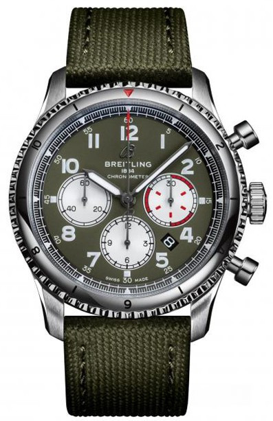 Breitling Aviator 8 B01 Chronograph 43 Curtiss Warhawk реф. AB0119 поставляется в корпусе из нержавеющей стали диаметром 43 мм с вращающимся в обе стороны безелем. На безель нанесены арабские цифры и индексы, а также практичный красный указатель в виде треугольника. Покрытие Super-LumiNova на часовой и минутной стрелках и арабские цифры на циферблате облегчают считывание времени при любом освещении. Контрастные серебристые циферблаты - 12-часовой, 30-минутный счетчики хронографа и малая секундная стрелка - указывают на то, что часы приводятся в действие сертифицированным COSC мануфактурным Калибром Breitling 01, обеспечивающим запас хода около 70 часов. Балансовая частота механизма составляет 28 800 пк/ч. Breitling Aviator 8 B01 Chronograph 43 Curtiss Warhawk имеет прозрачную заднюю крышку из сапфирового стекла с надписью Curtiss и изображением боевого истребителя P-40.