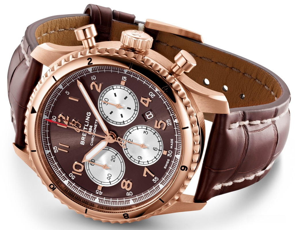 Breitling Aviator 8 B01 Chronograph 43 поставляется в корпусе из розового золота 18к диаметром 43 мм с вращающимся в обе стороны безелем. На безель нанесены арабские цифры и индексы, а также практичный указатель в виде треугольника. Покрытие Super-LumiNova на часовой и минутной стрелках и арабские цифры на циферблате облегчают считывание времени при любом освещении. Контрастные циферблаты - 12-часовой, 30-минутный счетчики хронографа и малая секундная стрелка - указывают на то, что часы приводятся в действие сертифицированным COSC мануфактурным Калибром Breitling 01, обеспечивающим запас хода около 70 часов. Балансовая частота механизма составляет 28 800 пк/ч. Breitling Aviator 8 B01 Chronograph 43  поставляются на ремешке из кожи аллигатора с вставкой из розового золота 18к.