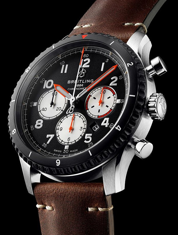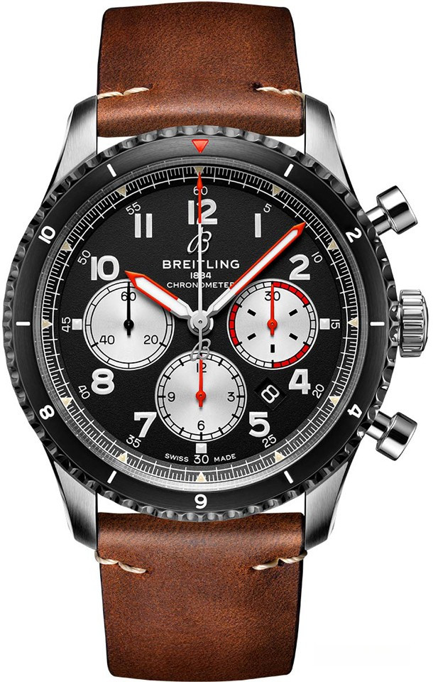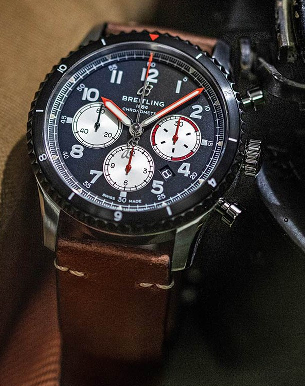 Новинка в коллекции Aviator обладает 43-миллиметровым корпусом из нержавеющей стали с черным безелем из ADLC покрытия, с красной стрелкой, указателями и арабскими цифрами. По сравнению с обычным покрытием DLC (алмазоподобный углерод), обработка ADLC (аморфный алмазоподобный углерод) обеспечивает еще более темный оттенок при дальнейшем повышении твердости. Черный циферблат имеет контрастные серебристые субциферблаты, что характерно для моделей Aviator 8, укомплектованных мануфактурным механизмом Breitling 01. Циферблат дополнен апертурой даты между 4 и 5 часами. Видимый через прозрачную сапфировую заднюю крышку корпуса, Калибр Breitling 01 обеспечивает запас хода около 70 часов и балансовую частоту 4 Гц (28 800 полуколебаний в час). Он сертифицирован как хронометр Швейцарским официальным институтом тестирования хронометров (COSC). Водостойкий до 100 метров, Breitling Aviator 8 Mosquito представлен на коричневом винтажном кожаном ремешке.