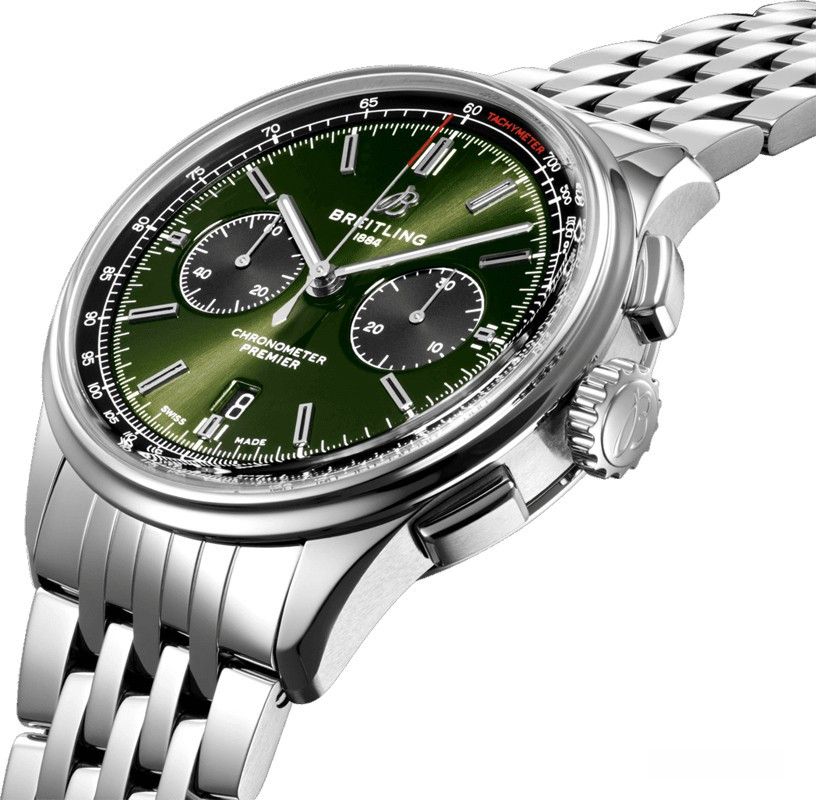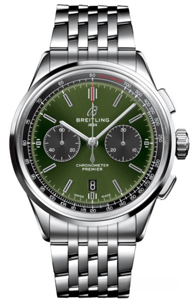 Часы Breitling Premier B01 Chronograph 42 представлены в корпусе из нержавеющей стали размером 42 х 13.65 мм. Внутри корпуса установлен автоматический механизм, Калибр Breitling 01, обладающий запасом хода 70 часов. На зеленом с серым циферблате отображаются часы, минуты, секунды, дата, тахиметр, накопители хронографа. Часы поставляются на браслете из нержавеющей стали. Водонепроницаемость корпуса составляет 100 метров.