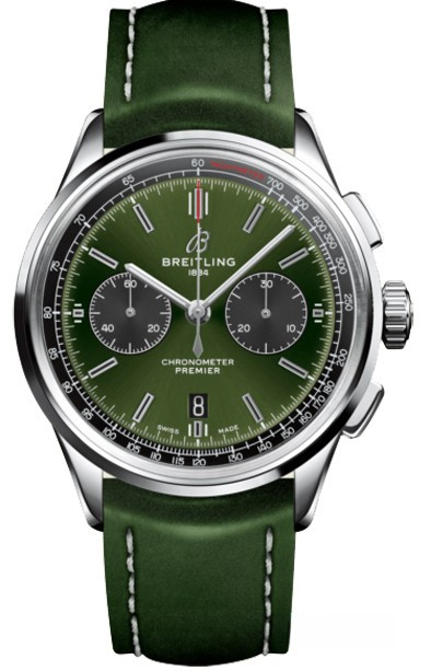 Часы Breitling Premier B01 Chronograph 42 представлены в корпусе из нержавеющей стали размером 42 х 13.65 мм. Внутри корпуса установлен автоматический механизм, Калибр Breitling 01, обладающий запасом хода 70 часов. На зеленом с серым циферблате отображаются часы, минуты, секунды, дата, тахиметр, накопители хронографа. Часы поставляются на кожаном ремешке с вставкой из нержавеющей стали. Водонепроницаемость корпуса составляет 100 метров.