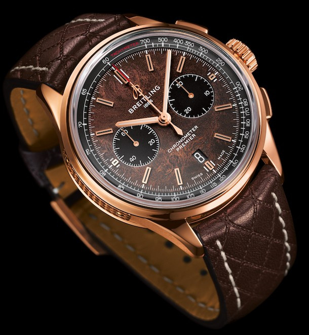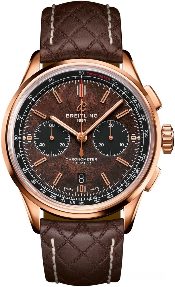 Часы Breitling Premier Bentley Centenary Limited Edition - это хронограф, выпущенный ограниченной серией 200 штук в корпусе размером 42 x 13.6 мм. Корпус часов изготовлен из розового золота 18к. Циферблат с двумя накопителями хронографа и апертурой даты на 6-ти часах. Вокруг циферблата Breitling белым цветом нанесена тахиметрическая шкала. Циферблат часов уникальный. Он изготовлен из коричневого вяза. Дерево придает глубину композиции, узор каждого циферблата неповторим благодаря природному происхождению материала. В новинке Breitling используется Калибр 01 с сертификатом хронометра и 70-часовым запасом хода. Механизм можно видеть через прозрачную заднюю крышку, на которой выгравирован логотип Bentley, а также количество часов в серии. К левой стороне корпуса прикреплена табличка с гравировкой «Bentley». Часы представлены на коричневом кожаном ремешке со строчкой, вдохновленной интерьером автомобилей.