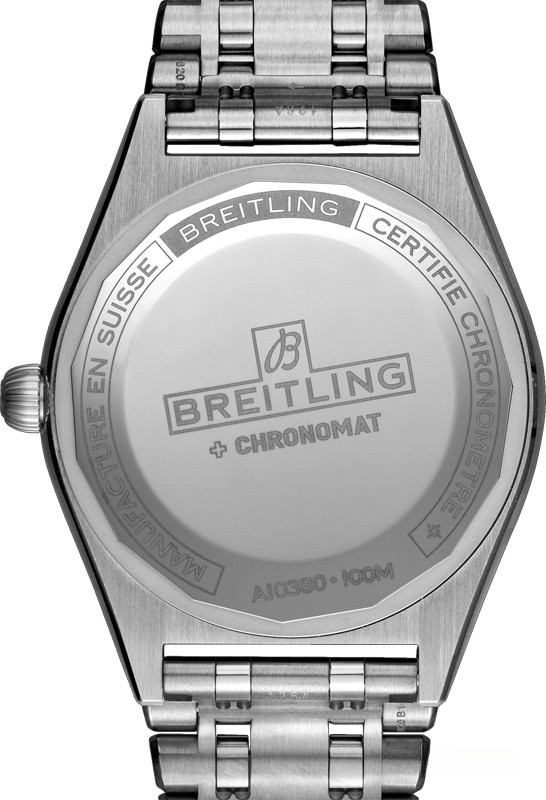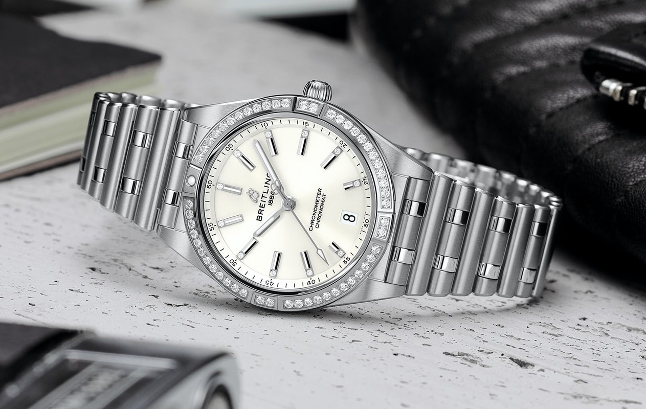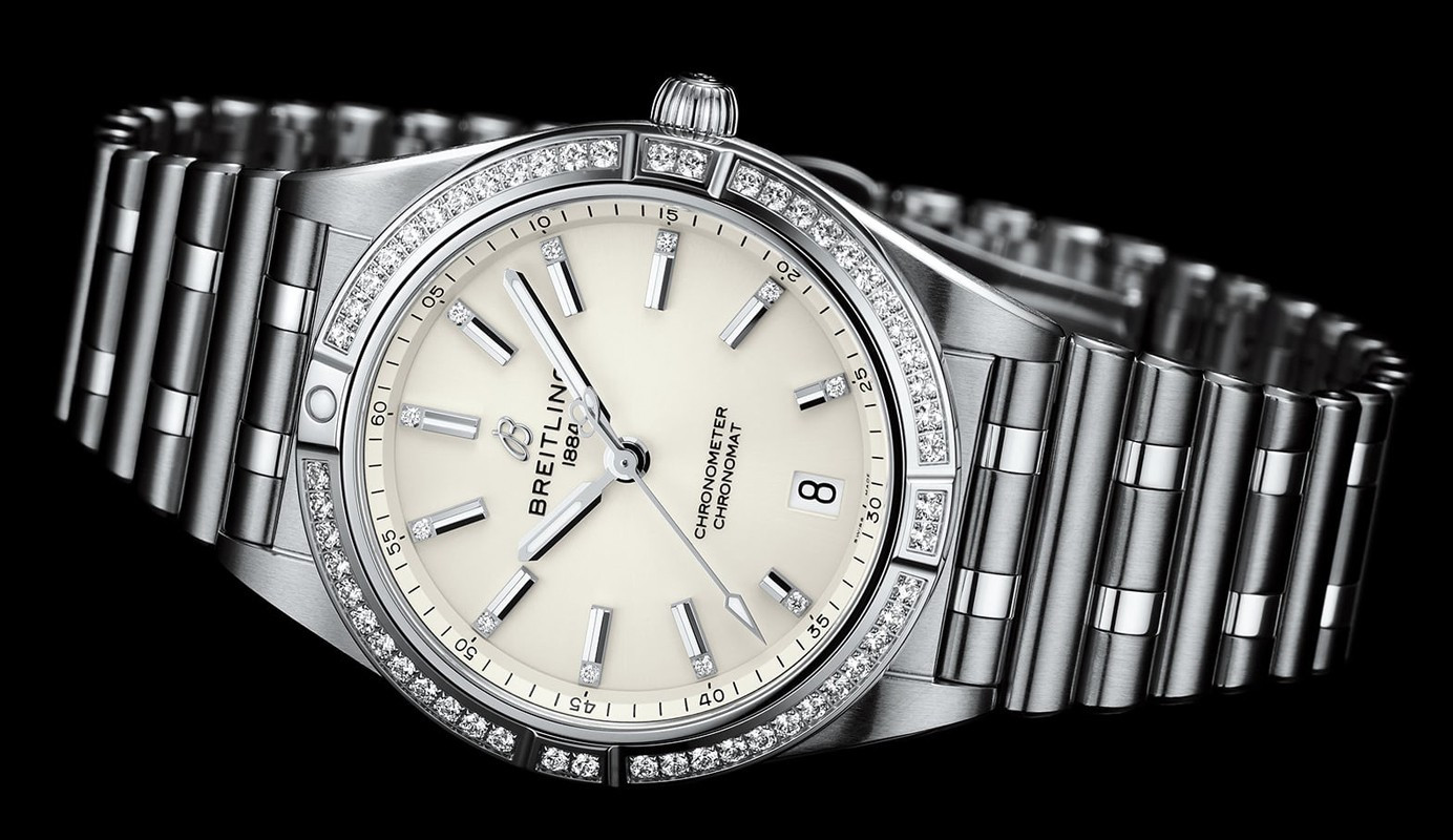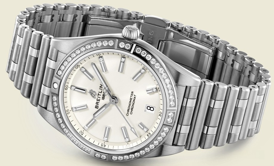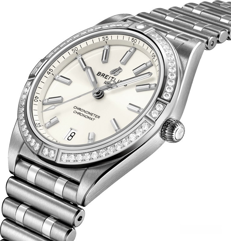 Часы Breitling Chronomat Automatic 36 представлены в корпусе из нержавеющей стали размером 36 х 10.01 мм водонепроницаемостью 100 метров. Внутри корпуса установлен автоматический механизм, Калибр Breitling 10, обладающий запасом хода 42 часа. На белом циферблате с 11-ю белыми бриллиантами отображаются часы, минуты, секунды, дата. Часы поставляются на браслете из нержавеющей стали. Безель из белых бриллиантов.