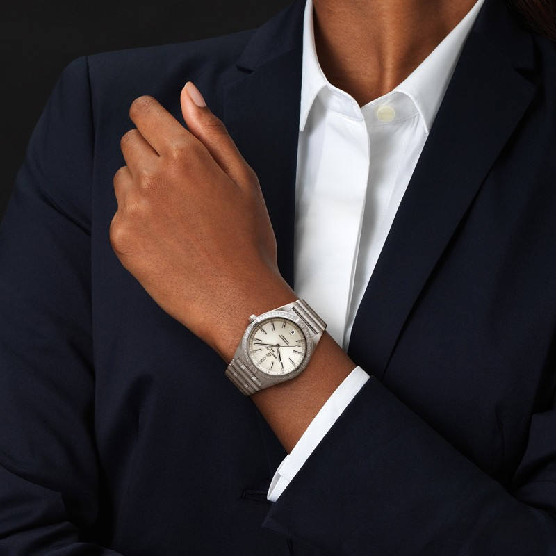 водонепроницаемость 100 м, вращающийся безель из белых бриллиантов