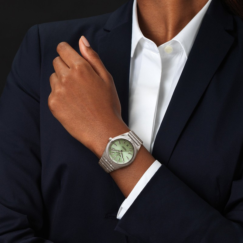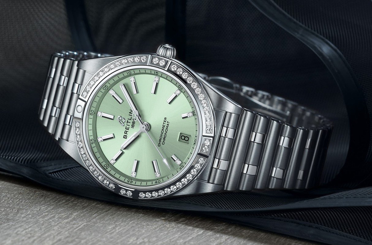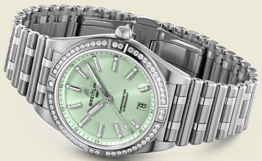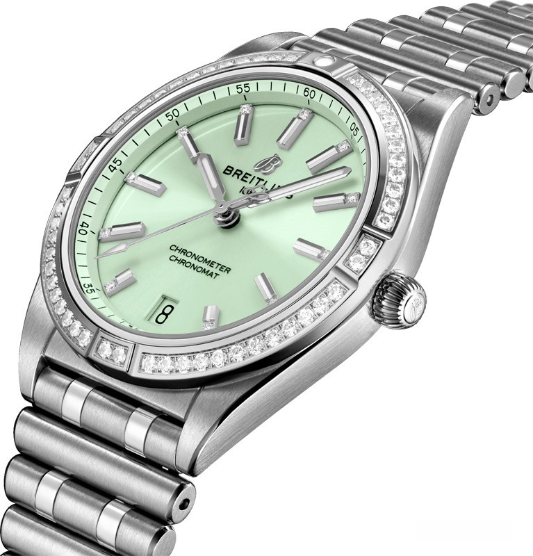 Часы Breitling Chronomat Automatic 36 представлены в корпусе из нержавеющей стали размером 36 х 10.01 мм водонепроницаемостью 100 метров. Внутри корпуса установлен автоматический механизм, Калибр Breitling 10, обладающий запасом хода 42 часа. На зеленом циферблате с 11-ю белыми бриллиантами отображаются часы, минуты, секунды, дата. Часы поставляются на браслете из нержавеющей стали. Безель из белых бриллиантов.