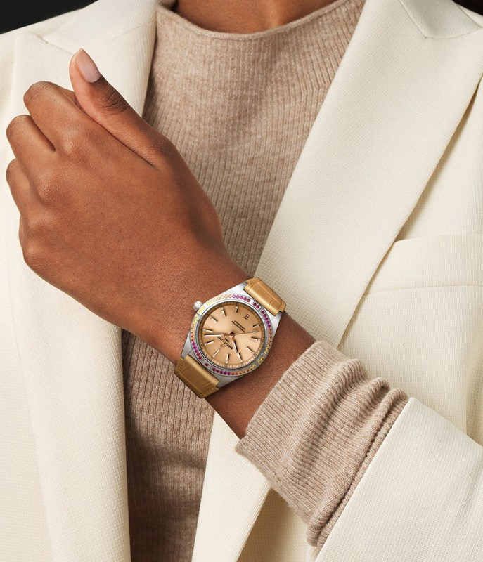 водонепроницаемость 100 м, вращающийся безель из разноцветных сапфиров