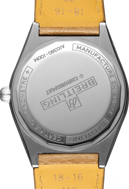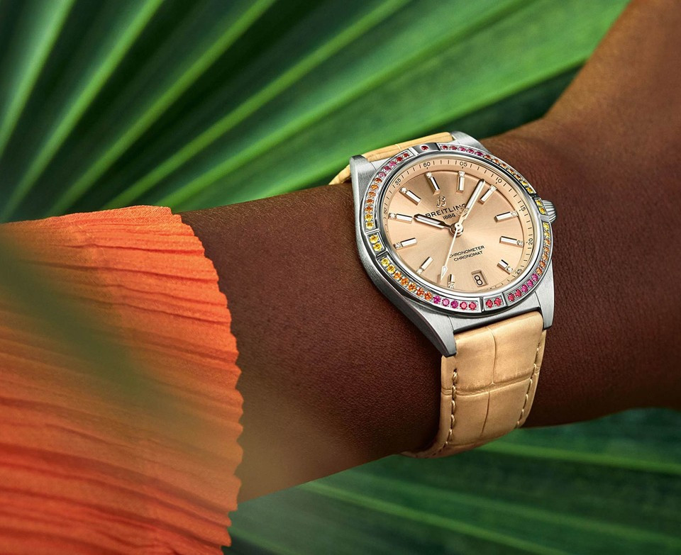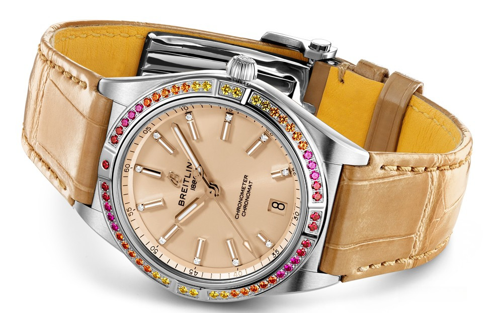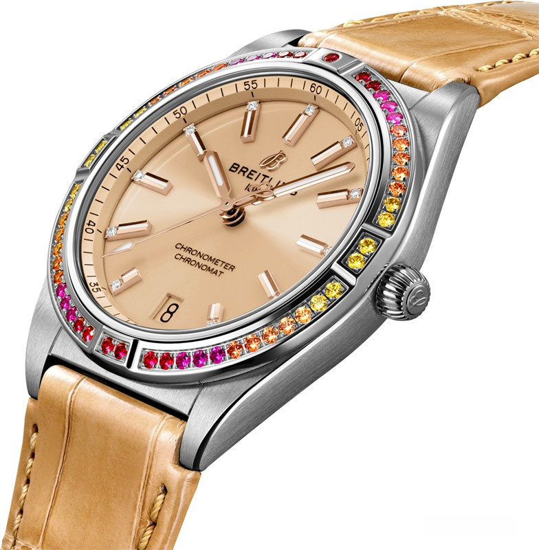 Часы Breitling Chronomat Automatic 36 представлены в корпусе из нержавеющей стали размером 36 х 10.01 мм водонепроницаемостью 100 метров. Внутри корпуса установлен автоматический механизм, Калибр Breitling 10, обладающий запасом хода 42 часа. На бежевом циферблате с 11-ю белыми бриллиантами отображаются часы, минуты, секунды, дата. Часы поставляются на ремешке из кожи аллигатора с вставкой из нержавеющей стали. Безель из разноцветных сапфиров.