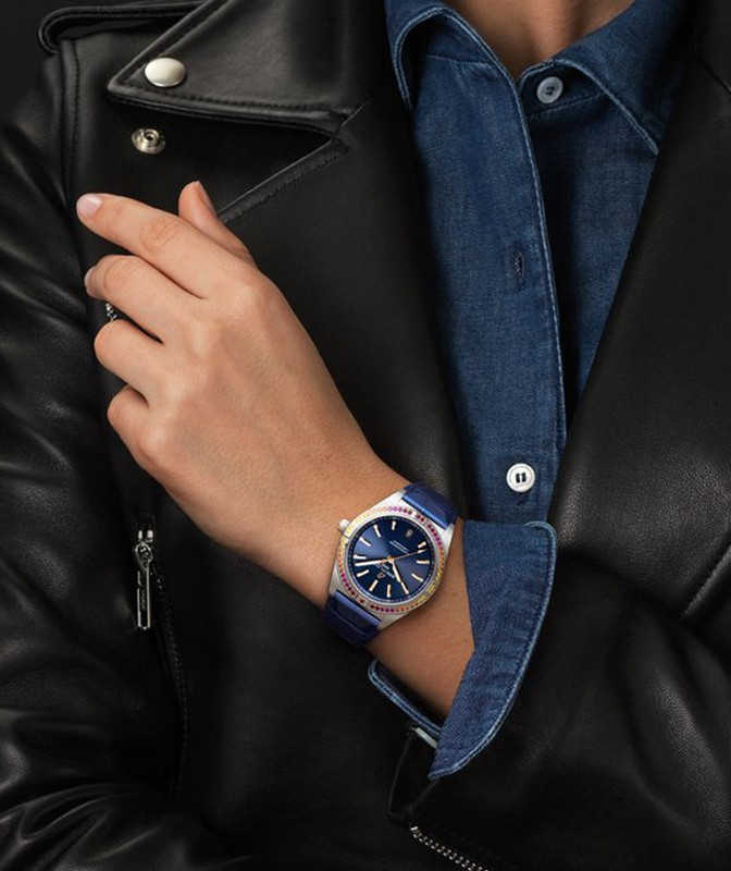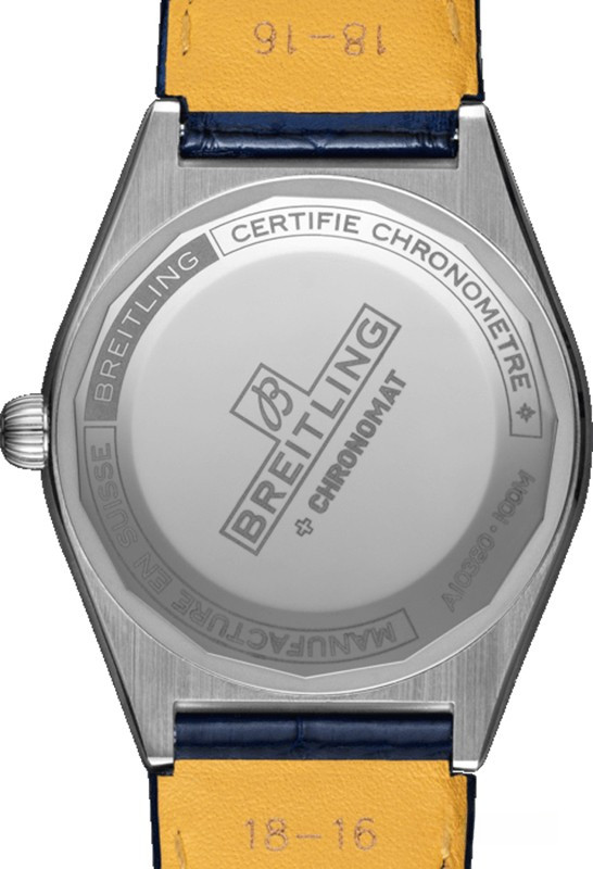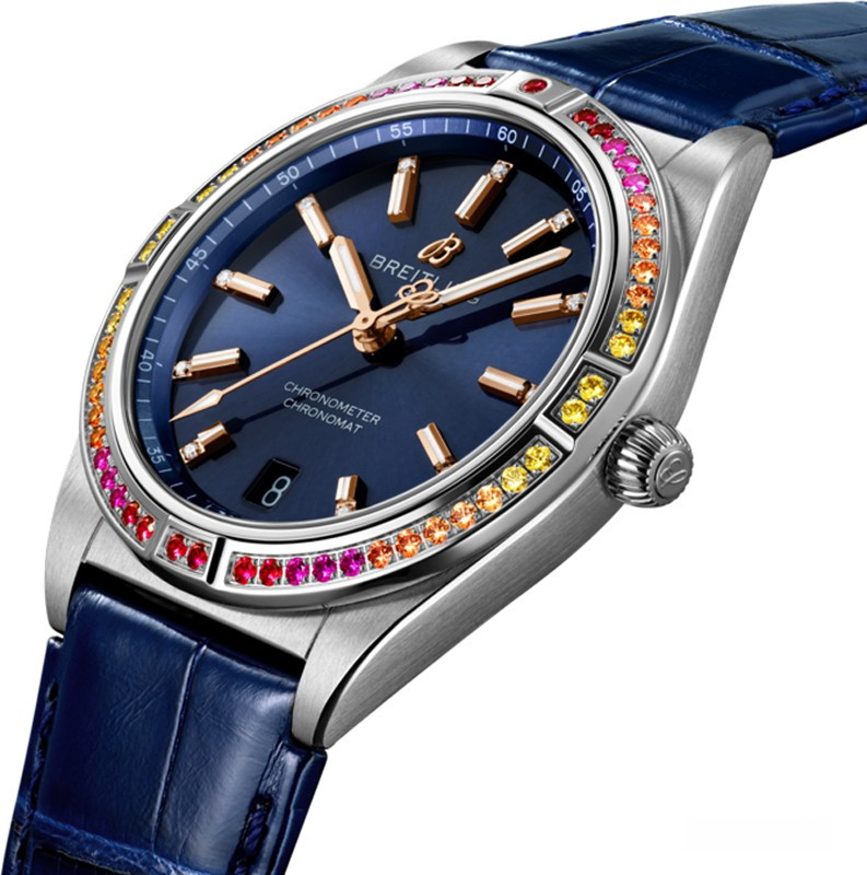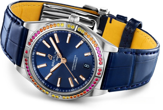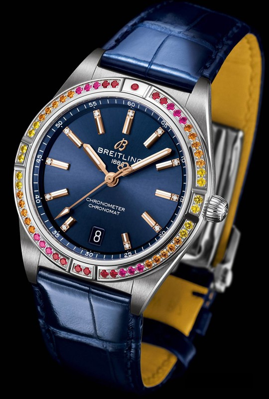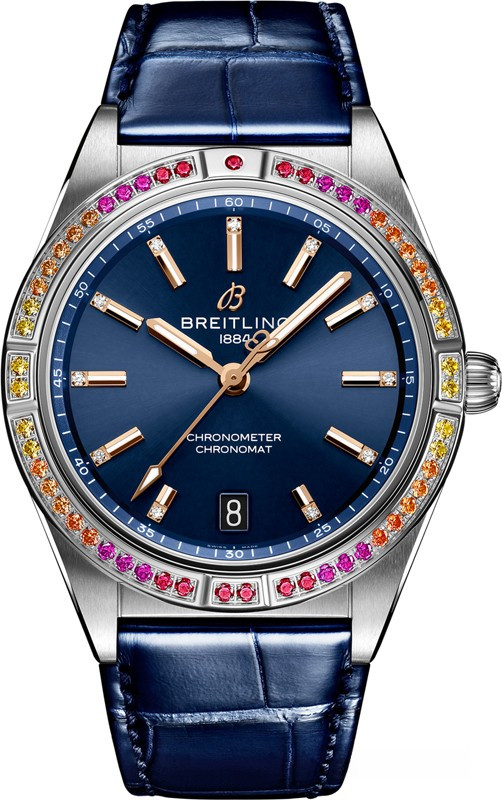 Часы Breitling Chronomat Automatic 36 представлены в корпусе из нержавеющей стали размером 36 х 10.01 мм водонепроницаемостью 100 метров. Внутри корпуса установлен автоматический механизм, Калибр Breitling 10, обладающий запасом хода 42 часа. На синем циферблате с 11-ю белыми бриллиантами отображаются часы, минуты, секунды, дата. Часы поставляются на ремешке из кожи аллигатора с вставкой из нержавеющей стали. Безель из разноцветных сапфиров.
