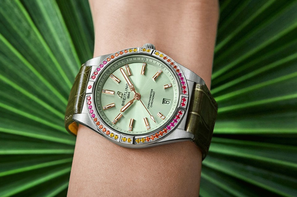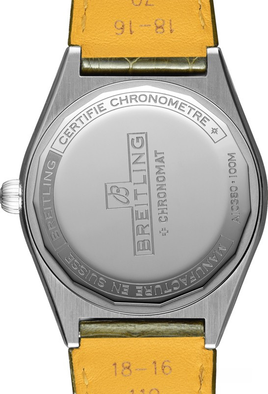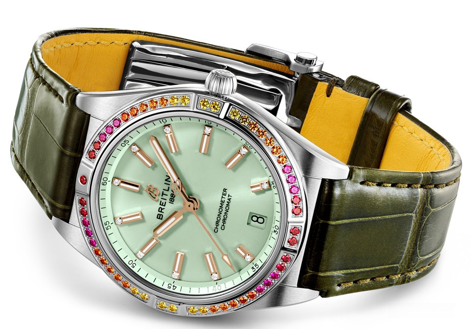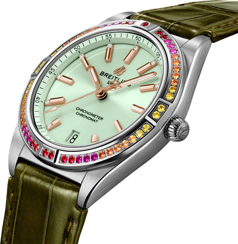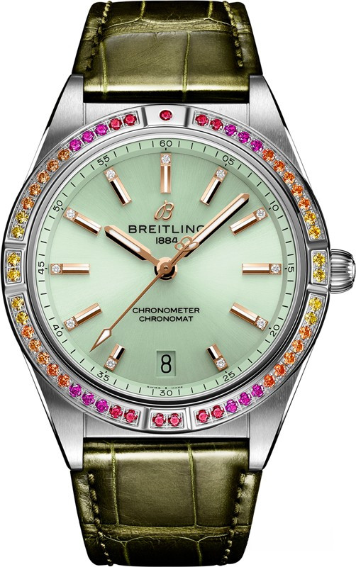 Часы Breitling Chronomat Automatic 36 представлены в корпусе из нержавеющей стали размером 36 х 10.01 мм водонепроницаемостью 100 метров. Внутри корпуса установлен автоматический механизм, Калибр Breitling 10, обладающий запасом хода 42 часа. На зеленом циферблате с 11-ю белыми бриллиантами отображаются часы, минуты, секунды, дата. Часы поставляются на ремешке из кожи аллигатора с вставкой из нержавеющей стали. Безель из разноцветных сапфиров.