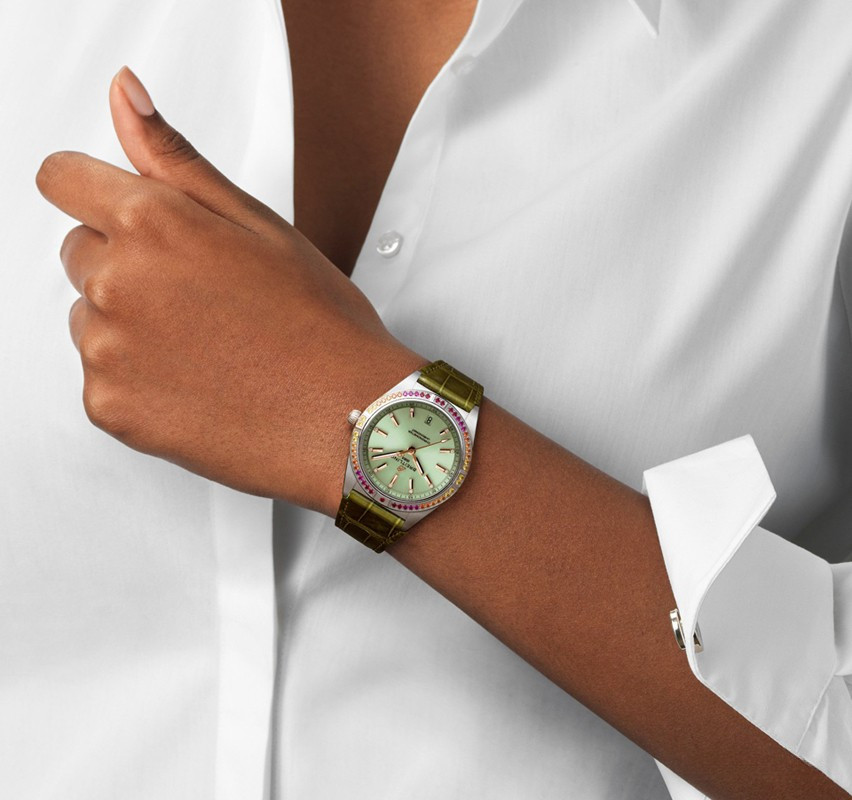 водонепроницаемость 100 м, вращающийся безель из разноцветных сапфиров