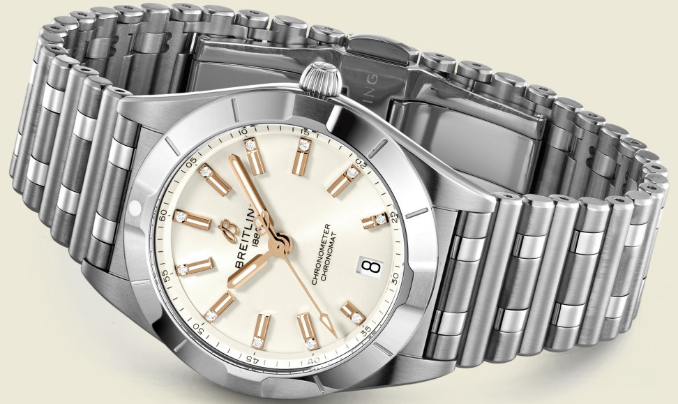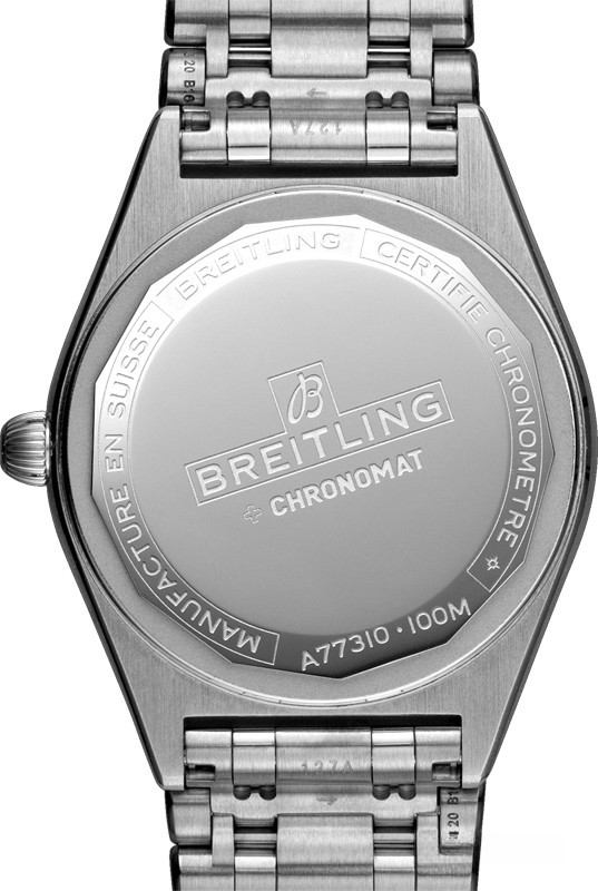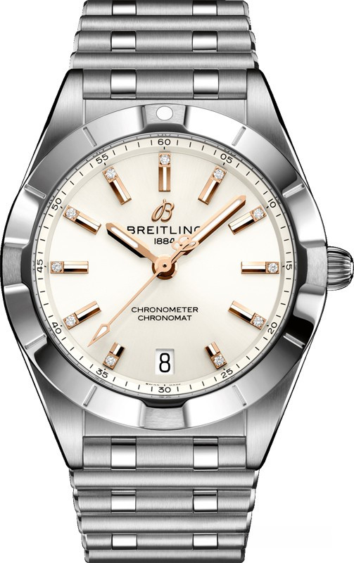 Часы Breitling Chronomat SuperQuartz 32 представлены в корпусе из нержавеющей стали размером 32 х 8.54 мм водонепроницаемостью 100 метров. Внутри корпуса установлен кварцевый механизм, Калибр Breitling 77. На серебристом циферблате с 11-ю белыми бриллиантами отображаются часы, минуты, секунды, дата. Часы поставляются на браслете из нержавеющей стали.