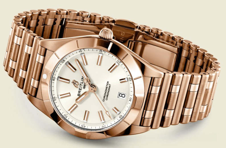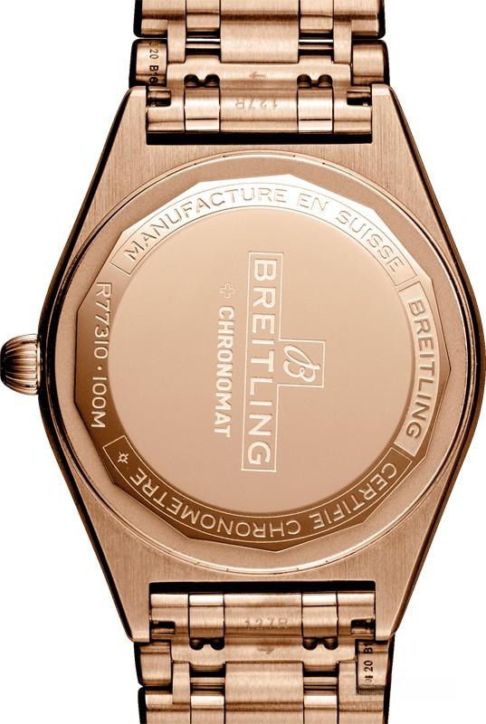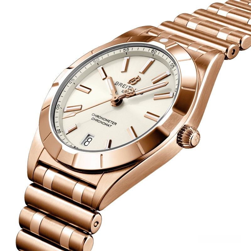 Часы Breitling Chronomat SuperQuartz 32 представлены в корпусе из розового золота 18к размером 32 х 8.54 мм водонепроницаемостью 100 метров. Внутри корпуса установлен кварцевый механизм, Калибр Breitling 77. На серебристом циферблате отображаются часы, минуты, секунды, дата. Часы поставляются на браслете из розового золота 18к.