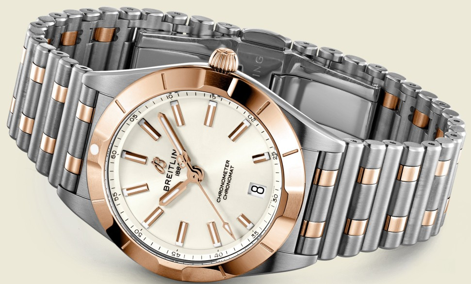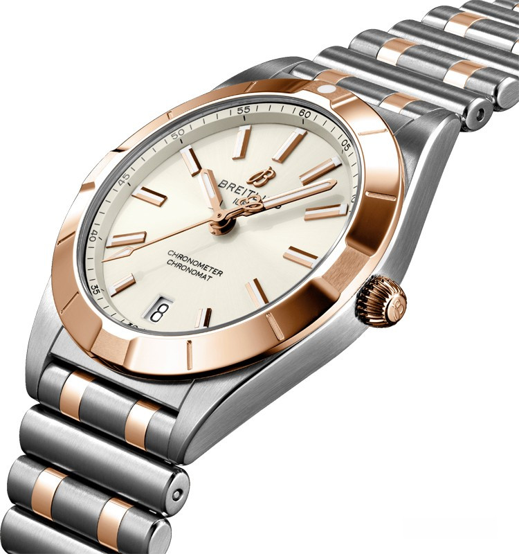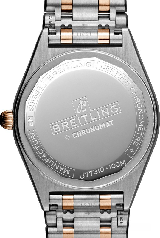 Часы Breitling Chronomat SuperQuartz 32 представлены в корпусе из нержавеющей стали и розового золота 18к размером 32 х 8.54 мм водонепроницаемостью 100 метров. Внутри корпуса установлен кварцевый механизм, Калибр Breitling 77. На белом циферблате отображаются часы, минуты, секунды, дата. Часы поставляются на браслете из нержавеющей стали и розового золота 18к.