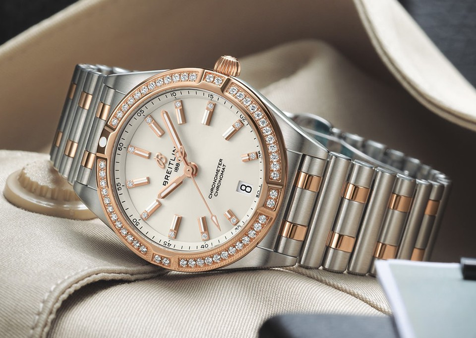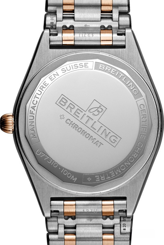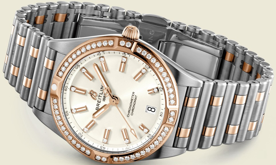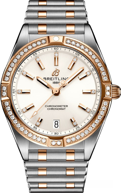 Часы Breitling Chronomat SuperQuartz 32 представлены в корпусе из нержавеющей стали и розового золота 18к размером 32 х 8.54 мм водонепроницаемостью 100 метров. Внутри корпуса установлен кварцевый механизм, Калибр Breitling 77. На белом циферблате с 11-ю белыми бриллиантами отображаются часы, минуты, секунды, дата. Часы поставляются на браслете из нержавеющей стали и розового золота 18к. Безель из белых бриллиантов.