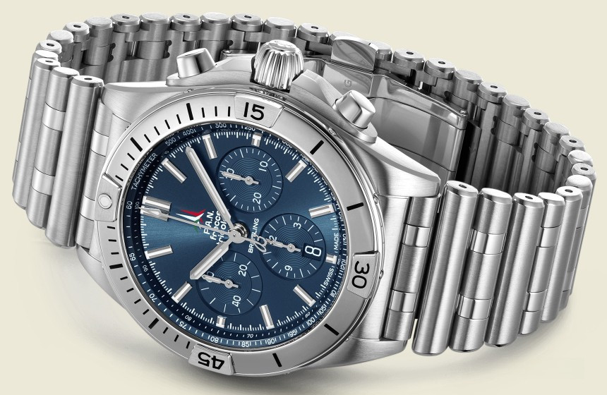 Часы Breitling Chronomat B01 42 Frecce Tricolori представлены в корпусе из нержавеющей стали размером 42 х 15.1 мм и водонепроницаемостью до 200 метров. Внутри корпуса установлен автоматический механизм, Калибр Breitling 1 с запасом хода 70 часов. На синем циферблате отображаются часы, минуты, секунды, дата, тахиметр, накопители хронографа. Часы комплектуются браслетом из нержавеющей стали. Серия ограничена - 250 шт.