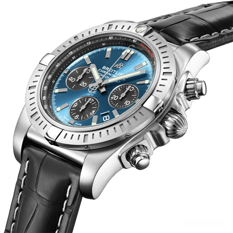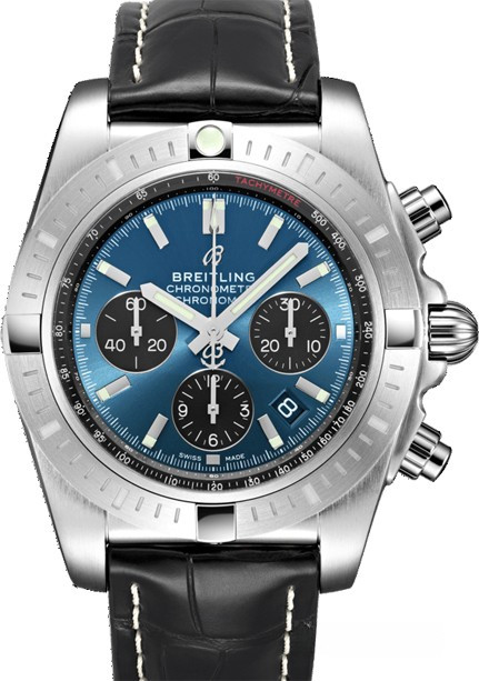 Breitling представили модель в коллекции Chronomat - B01 Chronograph 44. Часы выполнены в традиционном стиле для модели Chronomat с использованием сатинированного финиша корпуса, знакомого дизайна циферблата и знаменитого Калибра Breitling B01. Модель Chronomat B01 Chronograph 44 имеет синий с черным циферблат. Часы поставляются на ремешке из кожи аллигатора с вставкой из нержавеющей стали. Мощные и крупные мужские часы обладают корпусом размером 44 х 16.95 мм.