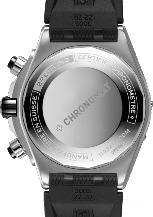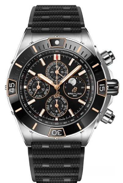 Часы Breitling Super Chronomat 44 Four Year Calendar представлены в корпусе из нержавеющей стали и розового золота 18к с керамическим безелем размером 44 х 14.5 мм водонепроницаемостью 100 метров. Внутри корпуса установлен автоматический механизм, Калибр Breitling 19, обладающий запасом хода 42 часа. На черном циферблате отображаются часы, минуты, секунды, дата, день недели, месяц, фаза луны, тахиметр. Часы поставляются на каучуковом ремешке с вставкой из нержавеющей стали.