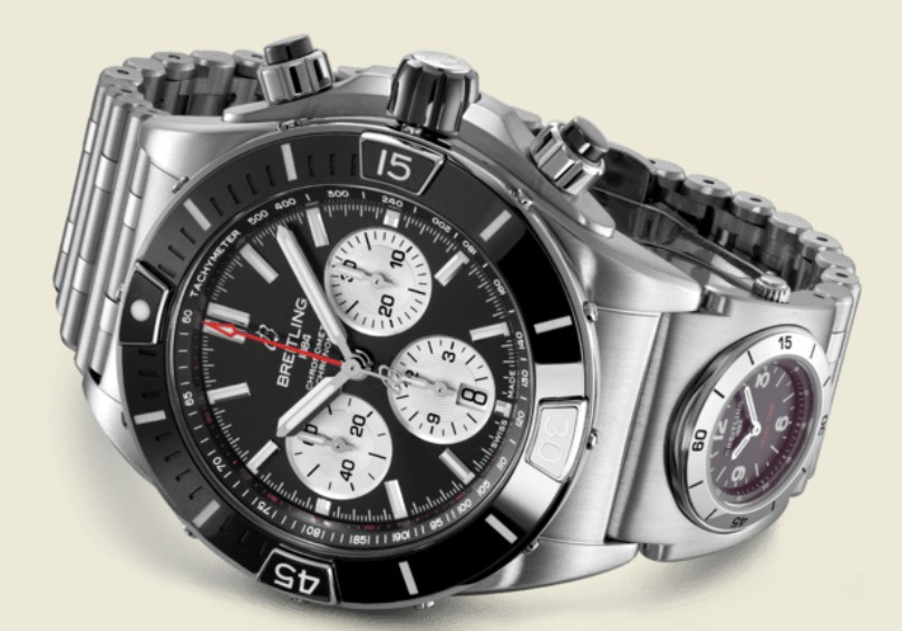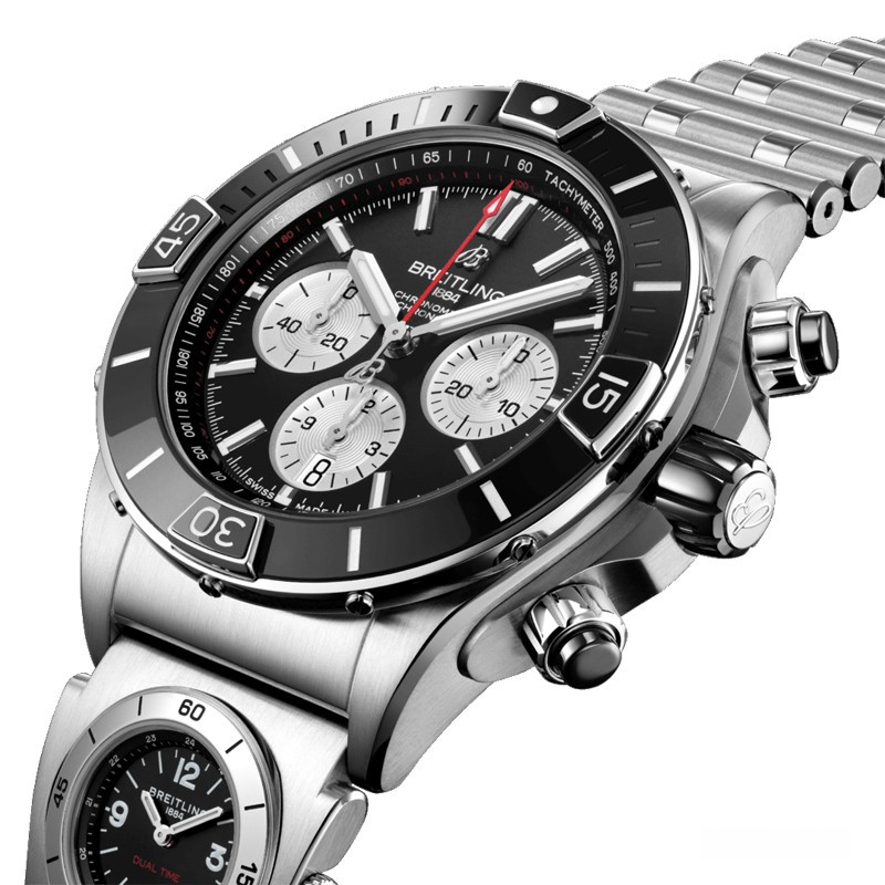 Часы Breitling Super Chronomat B01 44 представлены в корпусе из нержавеющей стали с керамическим безелем размером 44 х 14.4 мм водонепроницаемостью 200 метров. Внутри корпуса установлен автоматический механизм, Калибр Breitling 01, обладающий запасом хода 70 часов. На черном циферблате отображаются часы, минуты, секунды, дата, накопители хронографа, тахиметр, модуль UTC. Часы поставляются на браслете из нержавеющей стали.