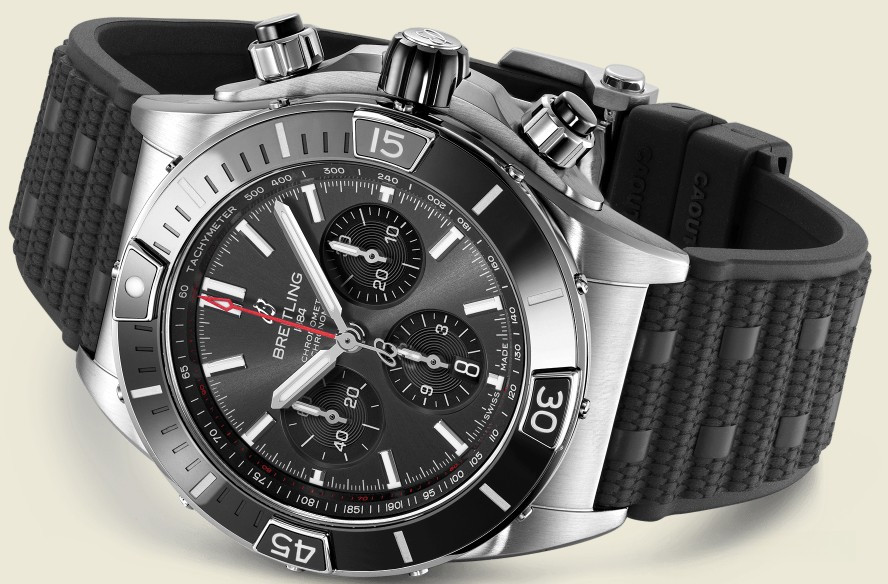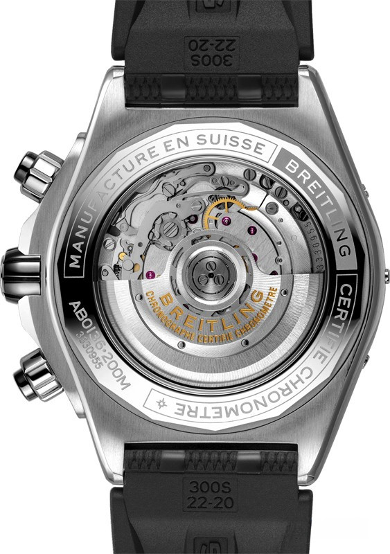 Часы Breitling Super Chronomat B01 44 представлены в корпусе из нержавеющей стали с керамическим безелем размером 44 х 14.4 мм водонепроницаемостью 200 метров. Внутри корпуса установлен автоматический механизм, Калибр Breitling 01, обладающий запасом хода 70 часов. На черном циферблате отображаются часы, минуты, секунды, дата, накопители хронографа, тахиметр. Часы поставляются на каучуковом ремешке с застежкой из нержавеющей стали.