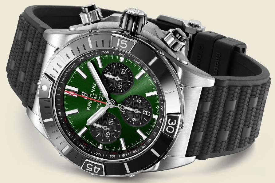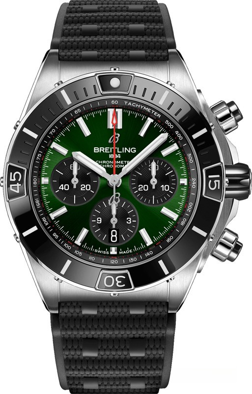 Часы Breitling Super Chronomat B01 44 представлены в корпусе из нержавеющей стали с керамическим безелем размером 44 х 14.4 мм водонепроницаемостью 200 метров. Внутри корпуса установлен автоматический механизм, Калибр Breitling 01, обладающий запасом хода 70 часов. На зеленом циферблате отображаются часы, минуты, секунды, дата, накопители хронографа, тахиметр. Часы поставляются на каучуковом ремешке с застежкой из нержавеющей стали.