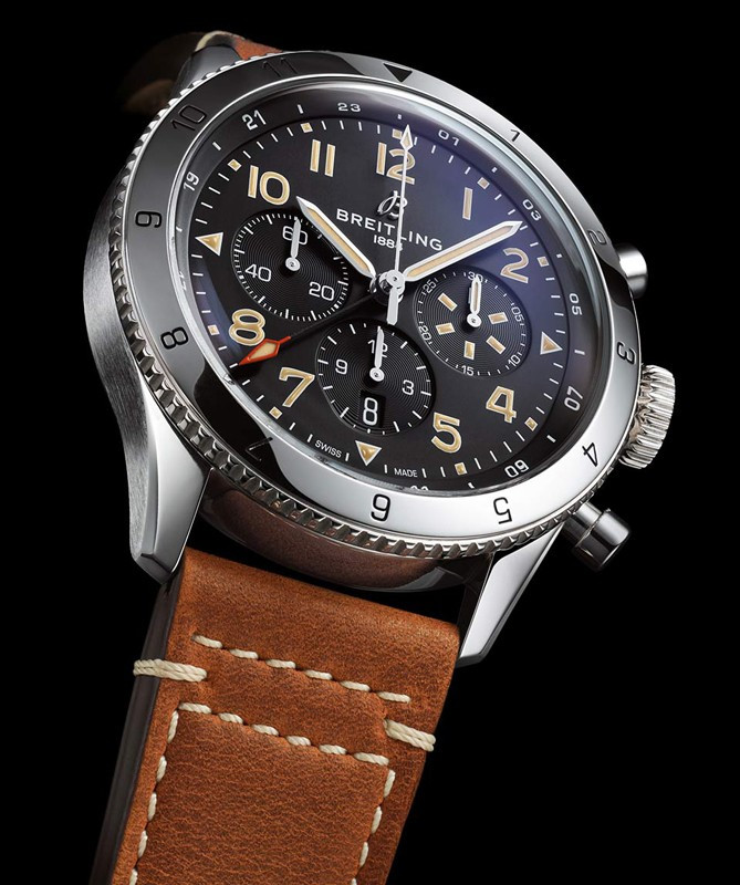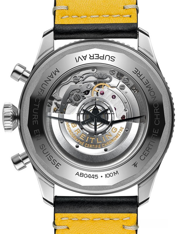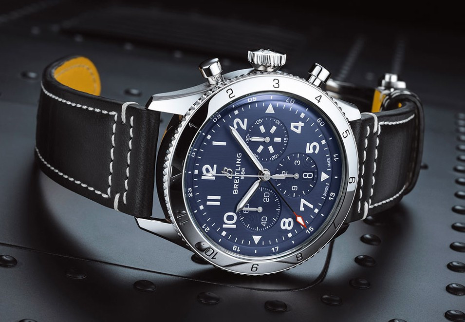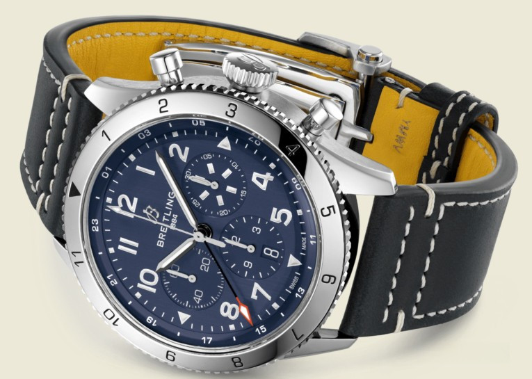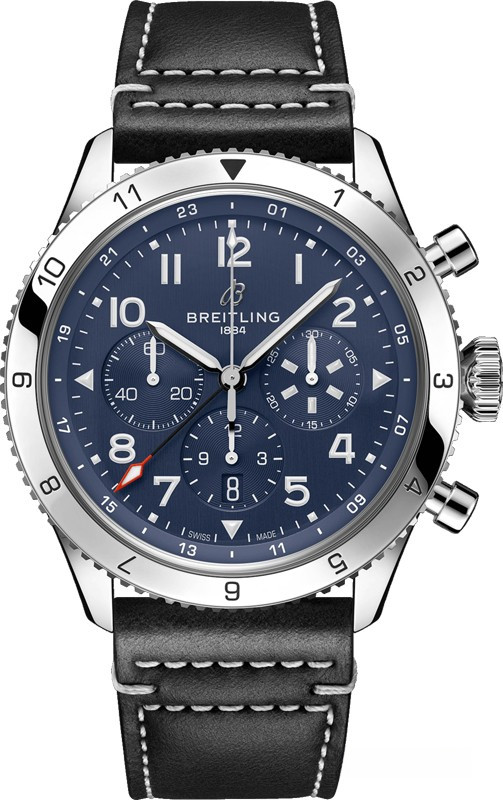 Часы Breitling Super-AVI представлены в корпусе из нержавеющей стали размером 46 х 15.9 мм водонепроницаемостью 100 метров. Внутри корпуса находится автоматический механизм, Калибр Breitling B04, обладающий запасом хода 70 часов. На синем циферблате отображаются часы, минуты, секунды, дата, хронограф.Часы поставляются на кожаном ремешке с застежкой из нержавеющей стали.