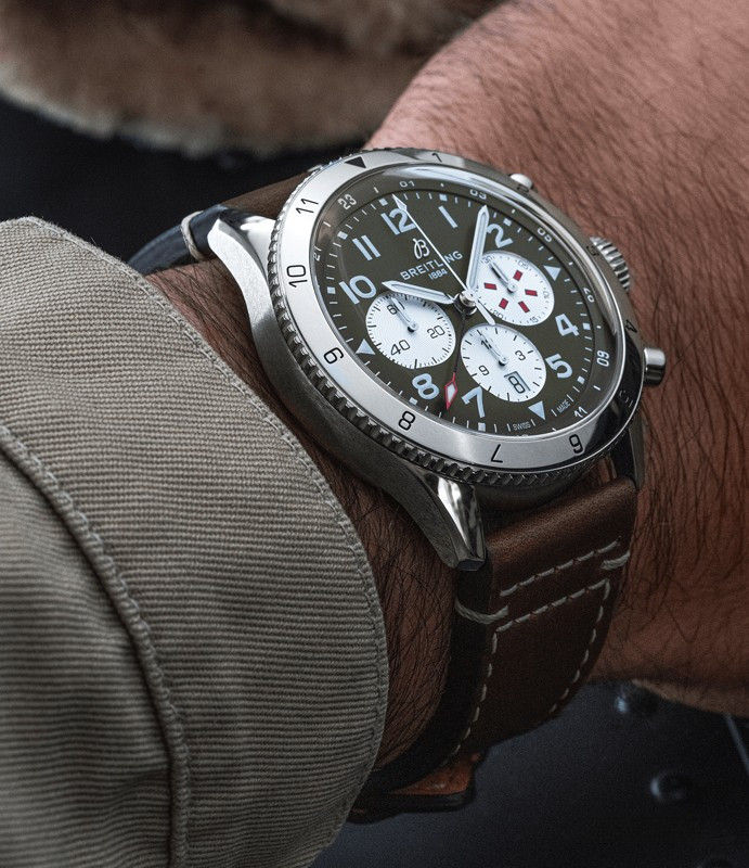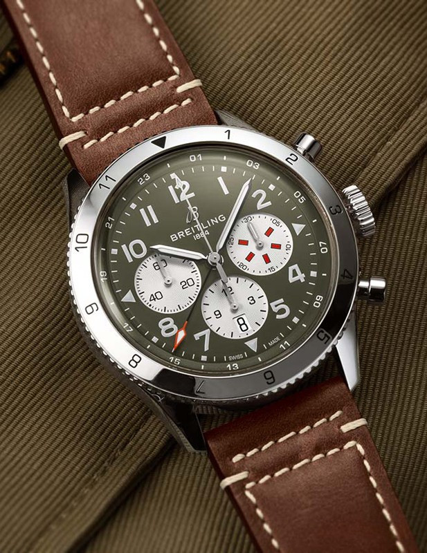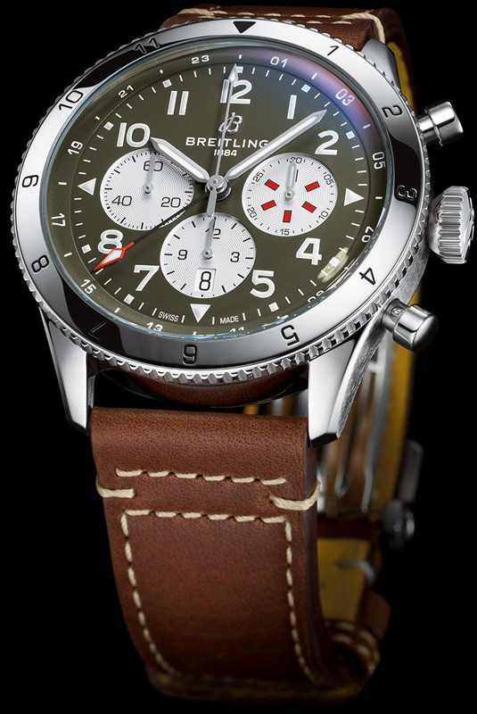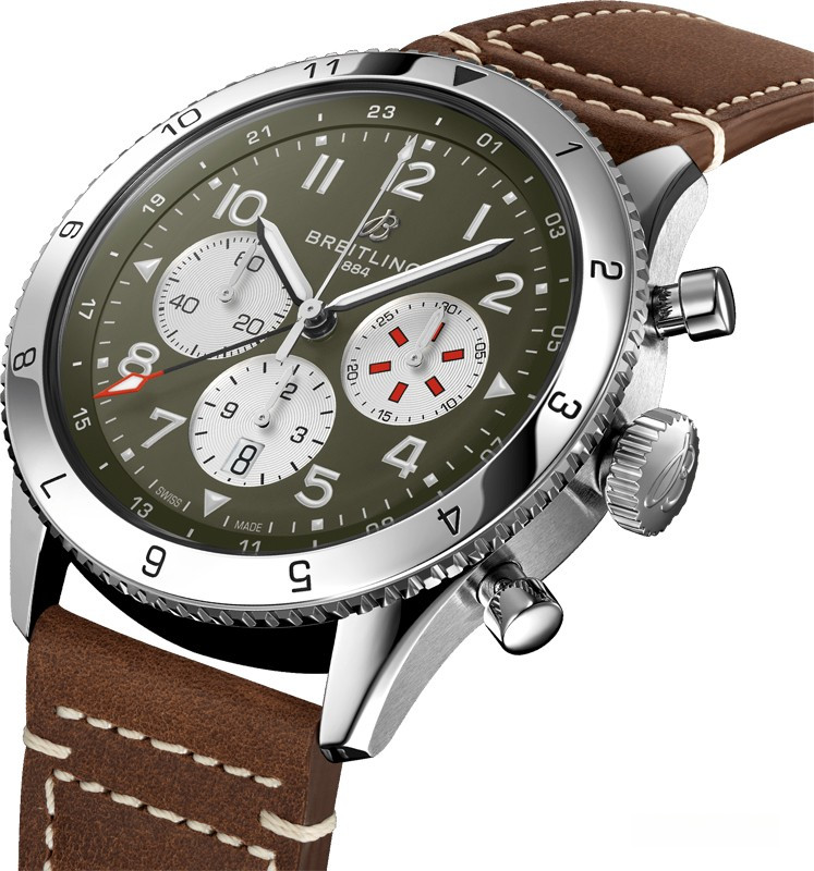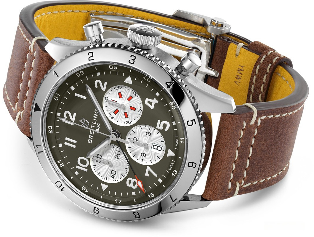 Часы Breitling Super-AVI представлены в корпусе из нержавеющей стали размером 46 х 15.9 мм водонепроницаемостью 100 метров. Внутри корпуса находится автоматический механизм, Калибр Breitling B04, обладающий запасом хода 70 часов. На зеленом с белым циферблате отображаются часы, минуты, секунды, дата, хронограф.Часы поставляются на кожаном ремешке с застежкой из нержавеющей стали.