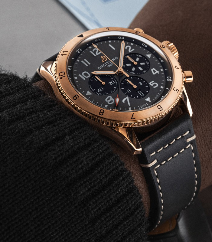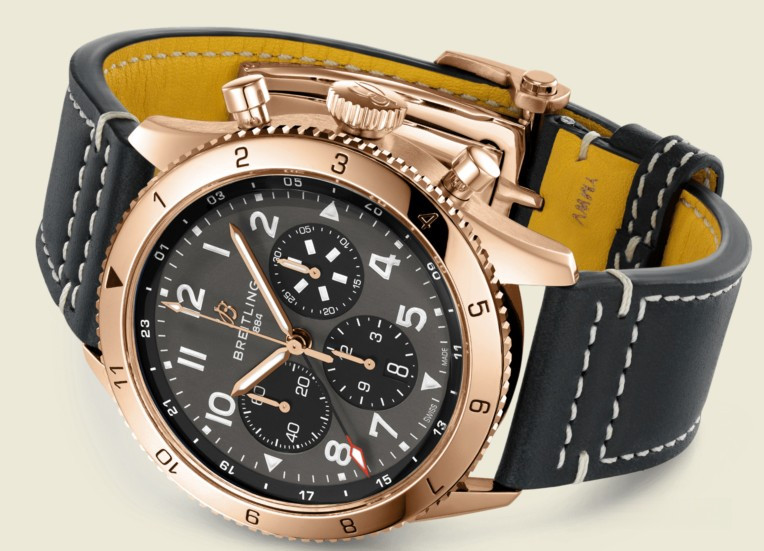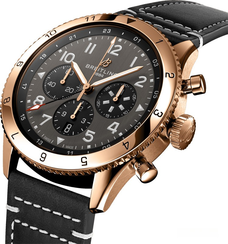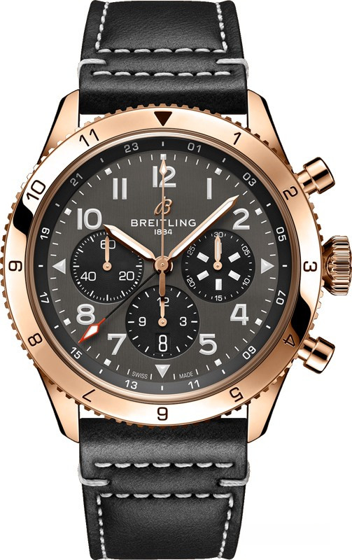 Часы Breitling Super-AVI представлены в корпусе из розового золота 18к размером 46 х 15.9 мм водонепроницаемостью 100 метров. Внутри корпуса находится автоматический механизм, Калибр Breitling B04, обладающий запасом хода 70 часов. На сером циферблате отображаются часы, минуты, секунды, дата, хронограф.Часы поставляются на кожаном ремешке с золотой застежкой.