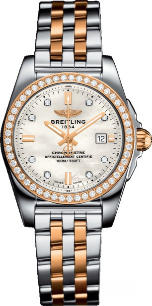 Часы Breitling Galactic 29 Sleek представлены в корпусе размером 29 х 8.9 мм из нержавеющей стали и розового золота 18к с водонепроницаемостью до 100 метров. Внутри корпуса установлен кварцевый механизм, Калибр Breitling 72. На белом жемчужном циферблате с 8-ю белыми бриллиантами отображаются часы, минуты, секунды, дата. Часы поставляются на браслете из нержавеющей стали и розового золота 18к. Безель из белых бриллиантов.