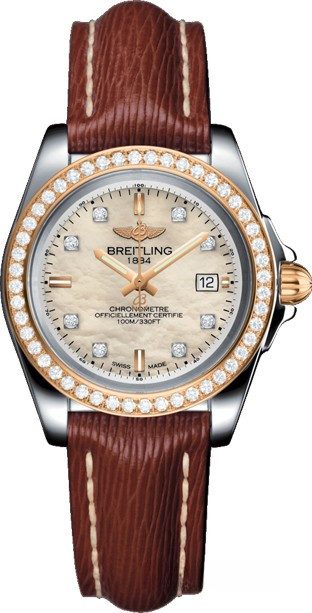 Часы Breitling Galactic 32 Sleek представлены в корпусе размером 32 х 10.79 мм из нержавеющей стали и розового золота 18к с водонепроницаемостью до 100 метров. Внутри корпуса установлен кварцевый механизм, Калибр Breitling 71. На белом жемчужном циферблате с 8-ю белыми бриллиантами отображаются часы, минуты, секунды, дата. Часы поставляются на кожаном ремешке с вставкой из нержавеющей стали. Безель из белых бриллиантов.