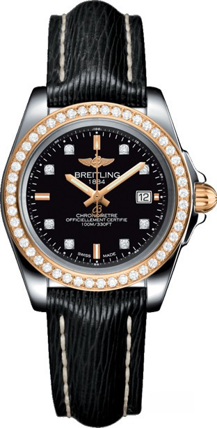 Часы Breitling Galactic 32 Sleek представлены в корпусе размером 32 х 10.79 мм из нержавеющей стали и розового золота 18к с водонепроницаемостью до 100 метров. Внутри корпуса установлен кварцевый механизм, Калибр Breitling 71. На черном циферблате с 8-ю белыми бриллиантами отображаются часы, минуты, секунды, дата. Часы поставляются на кожаном ремешке с вставкой из нержавеющей стали. Безель из белых бриллиантов.