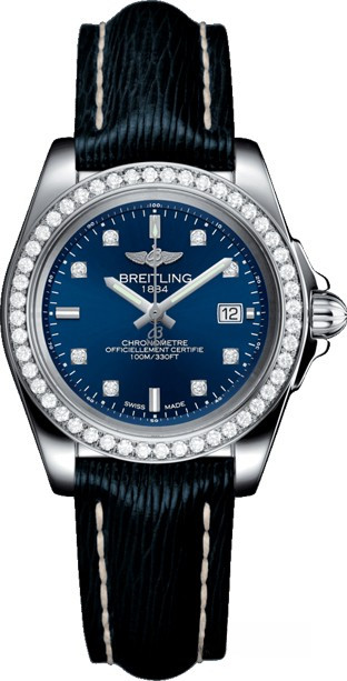 Часы Breitling Galactic 32 Sleek представлены в корпусе размером 32 х 10.79 мм из нержавеющей стали с водонепроницаемостью до 100 метров. Внутри корпуса установлен кварцевый механизм, Калибр Breitling 71. На синем циферблате с 8-ю белыми бриллиантами отображаются часы, минуты, секунды, дата. Часы поставляются на кожаном ремешке с вставкой из нержавеющей стали. Безель из белых бриллиантов.