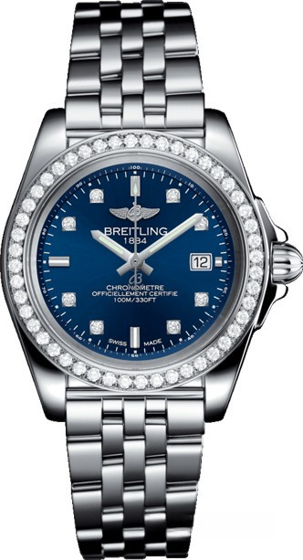 Часы Breitling Galactic 32 Sleek представлены в корпусе размером 32 х 10.79 мм из нержавеющей стали с водонепроницаемостью до 100 метров. Внутри корпуса установлен кварцевый механизм, Калибр Breitling 71. На синем циферблате с 8-ю белыми бриллиантами отображаются часы, минуты, секунды, дата. Часы поставляются на браслете из нержавеющей стали. Безель из белых бриллиантов.