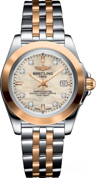 Часы Breitling Galactic 32 Sleek представлены в корпусе размером 32 х 10.79 мм из нержавеющей стали и розового золота 18к с водонепроницаемостью до 100 метров. Внутри корпуса установлен кварцевый механизм, Калибр Breitling 71. На белом жемчужном циферблате с 8-ю белыми бриллиантами отображаются часы, минуты, секунды, дата. Часы поставляются на браслете из нержавеющей стали и розового золота 18к.