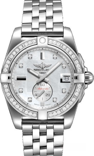 Часы Breitling Galactic 36 Automatic представлены в корпусе размером 36 х 12.3 мм из нержавеющей стали с водонепроницаемостью до 100 метров. Внутри корпуса установлен автоматический механизм, Калибр Breitling 37, обладающий запасом хода 42 часа. На белом жемчужном циферблате с 8-ю белыми бриллиантами отображаются часы, минуты, секунды, дата. Часы поставляются на браслете из нержавеющей стали. Безель из белых бриллиантов.