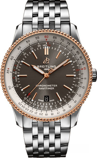 Часы Breitling Navitimer 1 Automatic 41 представлены в корпусе из нержавеющей стали и розового золота 18к размером 41 х 10 мм с вращающимся безелем и водонепроницаемостью 30 метров. Внутри корпуса установлен автоматический механизм, Калибр Breitling 17, обладающий запасом хода 38 часов. На сером циферблате отображаются часы, минуты, секунды, дата, тахиметр. Часы поставляются на браслете из нержавеющей стали.