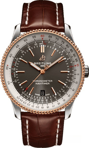 Часы Breitling Navitimer 1 Automatic 41 представлены в корпусе из нержавеющей стали и розового золота 18к размером 41 х 10 мм с вращающимся безелем и водонепроницаемостью 30 метров. Внутри корпуса установлен автоматический механизм, Калибр Breitling 17, обладающий запасом хода 38 часов. На сером циферблате отображаются часы, минуты, секунды, дата, тахиметр. Часы поставляются на ремешке из кожи аллигатора с вставкой из нержавеющей стали.